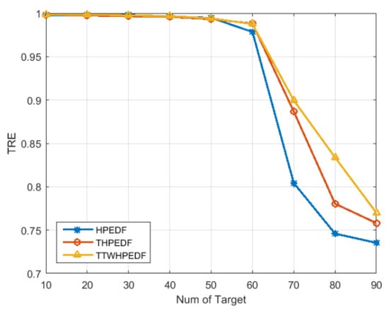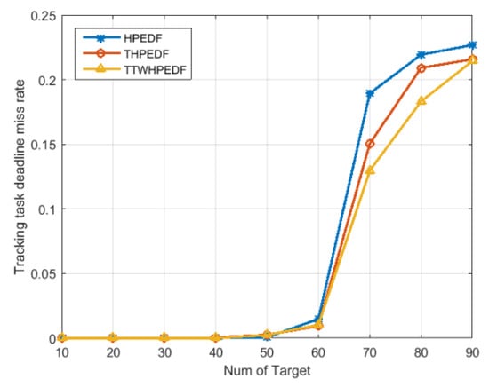 Figure 4 shows a comparison of missed deadline rates of tracking by the three scheduling algorithms. As shown in this figure, when the target number was less than 40, the missed deadline rate of tracking for the three scheduling algorithms was almost 0. When the target number was greater than 40, the missed deadline rate of tracking gradually began to increase. When the target number was greater than 60, the missed deadline rate of tracking had a significant increase. The missed deadline rate of tracking for the proposed TWD-HiPrEDF was significantly lower than that of the THiPrEDF, both of which were lower than the missed deadline rate of tracking for the HiPrEDF. The results show that the introduction of target threat degree and the three-way decision improves the tracking ability of the radar, enabling the radar to track the target more stably.