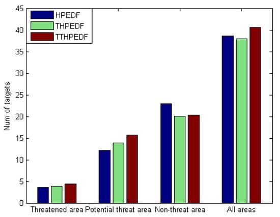 Further analysis of Figure 5 and Table 6 shows that the TWD-HiPrEDF algorithm could track more targets than the THiPrEDF in the three areas. At the same time, it has been found that compared with the HiPrEDF, the total number of targets under the THiPrEDF was reduced, and the total number of targets under the TWD-HiPrEDF was higher, indicating that the TWD-HiPrEDF can compensate for the shortage of reducing the total number of tracking targets in the THiPrEDF. In addition, compared with the other two algorithms, the TWD-HiPrEDF algorithm tracks the most targets in the threatened area. In summary, the proposed scheduling algorithm combining the threat assessment results with three-way decision can further deal with more targets with high threat and improve the tracking performance for targets with high threat while ensuring that the total number of tracking targets is not reduced.