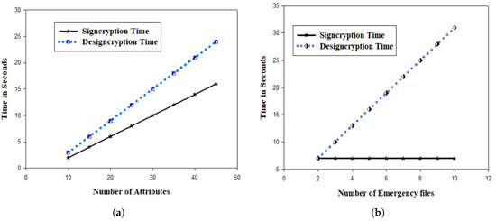 Signcryption/Designcryption time versus Number of Attributes (a) and Signcryption/Designcryption time versus Number Emergency Files (b).