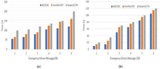 The rest of the parameters that were considered in our simulation are described in Table 5. Our simulation mainly focus on the size of the EDM because till now we cannot tell what would be the real size of EDM, therefore using a 5G benchmarked connection, we investigated the performance of signcryption of EDM based on different sizes. The size of an EDM message varies between 1 to 6 Gigabytes. Figure 3b shows that the time needed by a vehicle to signcrypt an EDM, ranges between 20 to 40 s for an EDM that has a size of 2 GB. In addition, we investigated the overall time to signcrypt and designcrypt an EMD as shown in Figure 3a, we still found that as long as an EDM does not go beyond 2 GB of size, the overall time is not that much when we consider the 5G projected features. In this case, the highest record which corresponds to Serpent/CTR algorithm is around 100 s.