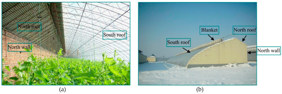 As shown in Figure 1, the architecture of a CSG consists of a south roof, north roof, north wall, gables, and blanket. In many cases, a CSG is east-west oriented to intercept more solar energy. In the cold season, the blanket is rolled up during the day and the sunlight enters from the south roof. The crops, ground, north wall, and gables absorb energy. After the blanket is dropped at night, the gables and north wall release heat to maintain temperature [39].