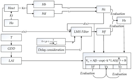 The flow chart of data processing is shown in Figure 2. Firstly, Hout and Hs were obtained from a weather station and the sensors inside the greenhouse. Hc was calculated according Equations (6)–(11). Secondly, Hout and Hc were used as the x(n) and d(n) input signals for the LMS filter, respectively; therefore, the output signal of the LMS filter was the estimation of Hi and is presented as Hf. The required water volume for tomato, according to Hc, Hf, and Hs, which are presented as Vc, Vf, and Vs, respectively, were calculated via Equations (13)–(16).