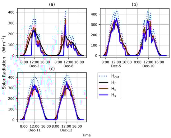 Computations were performed using data from six days according to the procedure in Section 2.6. The curves of Hout, Hc, Hf, and Hs are shown in Figure 3. Two days were sunny, 11 and 12 December. In Figure 3c, the curve of Hs fluctuated obviously near its peak value, whereas the curve of Hf, which tended to have a half-wave sinusoidal shape, was smooth. In other words, the fluctuation range of Hf was very narrow near noon. The fluctuations of Hout and Hc ranged between Hs and Hf. We observed quick changes in the curves of Hout and Hc near their peak value at about 11:00 each day and the quick changes were introduced by a metal bar installed nearby the weather station. So, the weather station measurements were temporarily disturbed by the shadow of the bar. In contrast, the curve of Hf proved to be immune to this temporary disturbance.