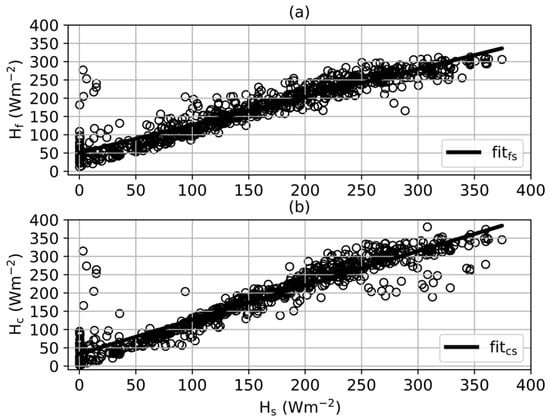 In Figure 4a, as Hs rose above 200 Wm−2, the number of points of Hf < Hs also increased gradually. When Hs rose above 300 Wm−2, the number of points of Hf < Hs was greater than the number of points of Hf > Hs. The details of the curves during 10:00–14:00 on 11 and 12 December indicates as Hs rose above 200 Wm−2, the increasing speed rose so the curve of Hs gradually stayed above the curve of Hf. Hence, the increasing number of points of Hf < Hs in Figure 3c contributed to the increasing rising speed of Hs. The peaks in the Hs curve on these two days in Figure 4a reached more than 300 Wm−2; so, when Hs > 300 Wm−2, the number of points of Hf < Hs dominated. Oscillation was observed when Hs rose above 200 Wm−2, so some Hf > Hs points were introduced.