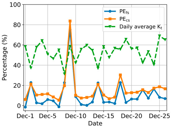 According to Equation (16), Ri was computed using Hc, Hf, and Hs, which are presented as Rc, Rf, and Rs, respectively. Tstart values were 08:15, 08:00, 08:00, 08:00, 11:00, 10:00 and Tstop values were 16:00, 16:15, 15:45, 16:15, 15:45, 16:00 on 11, 12, 5, 10, 2, 8 December, respectively. Then, Vc, Vf, and Vs. were calculated using Equation (15) as shown in Table 2. The PE of Vf–Vs. and Vc–Vs, presented as PEfs and PEcs, respectively, calculated via Equations (27) and (28), respectively, are also shown in Table 2.