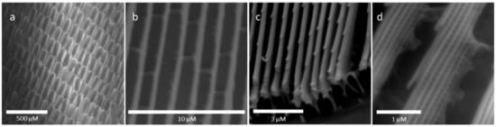 In turn, each scale contains about 70 ridges, each ridge less than 1 μm in width and running parallel to other ridges the length of the scale. Though difficult to observe in the images, these ridges are known to be thicker at the base (800 nm) than at the top (400 nm) and, as shown in Figure 1c, form a tree-like structure with six to eight lamellae forming the branch-like structures normal to each side of the ridge center []. These lamellae run the length of each ridge and are about 80 nm thick with about 150 nm vertical spacing between each lamellae layer. This gives a total height of each ridge of about 2 μm. Microribs, visible in Figure 1d, provide structural integrity by connecting lamellae within a ridge.