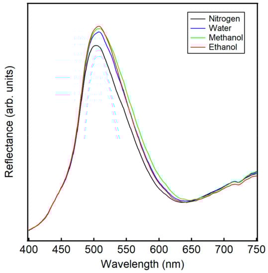 However, the optical response for a binary mixture of water and methanol did not fall between the values of the pure components. Inspection of Figure 3a–e shows that, while ΔR for a binary mixture of water and ethanol is additive from its individual components, this is not the case for the binary mixture of water and methanol. Instead, the overall ΔR for the water and methanol mixture remains closer to the value of methanol rather than lowering to a value closer to water as might be expected. A poor response of natural PhCs towards methanol and water mixtures has been previously noted in the literature [], highlighting one of the challenges of sensing via this technique—a non-additive response.