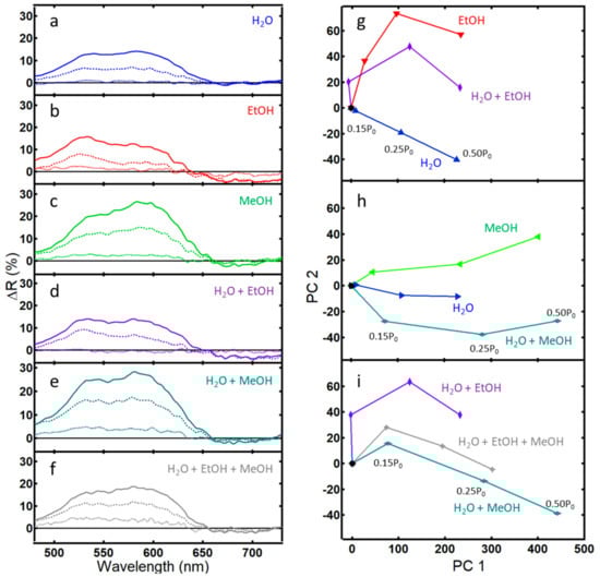 Differential spectra for single, binary, and tertiary vapors of water, ethanol, and methanol are shown in Figure 3a–f for concentrations of 0.15 P0, 0.25 P0, and 0.50 P0. The differential spectra, ΔR, is defined as: