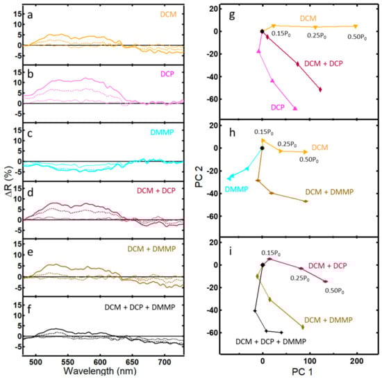 Differential reflectance data (ΔR) and corresponding PCA plots for light reflected from the PhC within wing scales of the Morpho didius butterfly: (a–f) ΔR after 5 min of exposure to the indicated vapor at concentrations 0.15 P0 (···), 0.25 P0 (--), and 0.50 P0 (—); (g) PCA scores plot of a binary vapor mixture of DCM and DCP that captures 84.9% of the variance (PC 1 = 72.9%); (h) PCA scores plot of a binary vapor mixture of DCM and DMMP that captures 80.9% of the variance (PC1 = 73.2%); (i) PCA scores plot of a tertiary vapor mixture of DCM, DCP, and DMMP that captures 78.9% of the variance (PC 1 = 58.8%).