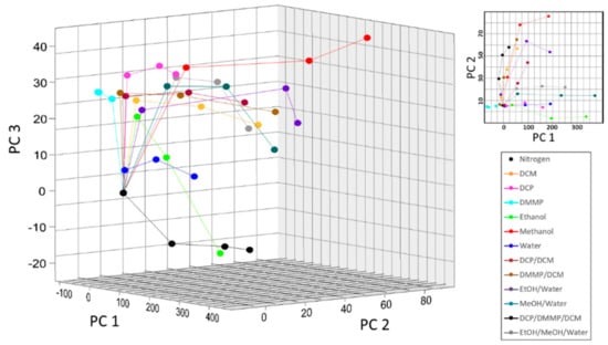 A PCA scores plot of all analytes tested in this work is shown Figure 5, where each data point in a trace corresponds to analyte concentrations of 0.15 P0, 0.25 P0, and 0.50 P0, respectively. While the optical response of the PhC to binary and tertiary mixtures were not always additive in this work, the system showed good selectivity and sensitivity to all analytes. Good selectivity was indicated by the distinct traces for each analyte evident in the three-dimensional scores plot []. This selectivity was evident despite similar refractive indices and concentrations, especially for mixtures containing CWA simulants because their vapor contributions were less than 0.2% by mass. Similar to previous work, no trends based on analyte polarity or refractive index were observed []. The sensitivity of the PhC was demonstrated by the spacing of individual data points within an analyte trace []. This sensitivity was evident over several orders of magnitude, from tens of ppm for CWA simulants up to tens of thousands of ppm for methanol. The CWA simulant DMMP was tested at concentrations as low as 120 ppm individually and 30 ppm in mixtures. The CWA simulant DCP was tested at concentrations as low as 240 ppm individually and 50 ppm in mixtures.