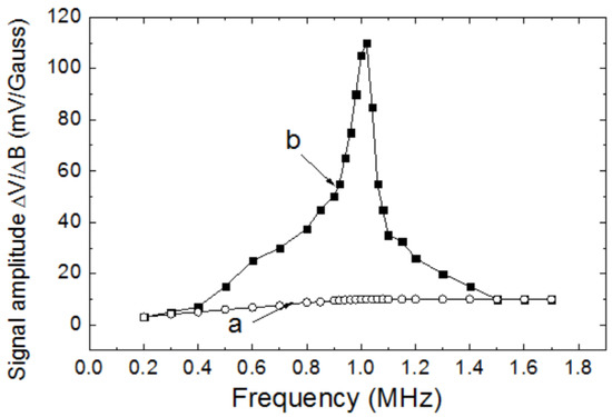 The signal amplitudes of the magnetic sensor with and without the resonant circuit were measured. Figure 6 shows the results. The line “a” in Figure 6 shows the signal amplitudes ΔV/ΔB of the magnetic sensor without the resonant circuit, and the line “b” in Figure 6 shows the signal amplitude ΔV/ΔB of the magnetic sensor with the resonant circuit. At the resonant frequency of about 1 MHz, the signal amplitude was increased by about 10 times: from about 10 mV/Gauss to about 100 mV/Gauss. Using Equation (1), the magnetic field resolution was estimated to be about 2 pT/√Hz when the resonant circuit was used. This was a theoretical value. For a real magnetic sensor, the magnetic field resolution of 6 pT/√Hz was achieved.