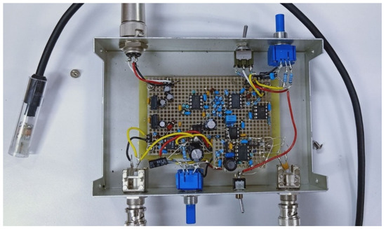The driving circuit was hand made. Figure 8 and Figure 9 show the images of the driving circuit. Only one coaxial cable was used to connect the sensor element with the driving circuit. Thus, the sensing part of the magnetic sensor can be made very small for some special application where only a small space is allowed. The potentiometer Bdc in the driving circuit was used to adjust the DC bias current, and the potentiometer Vdc was used to adjust the DC level of the output voltage.