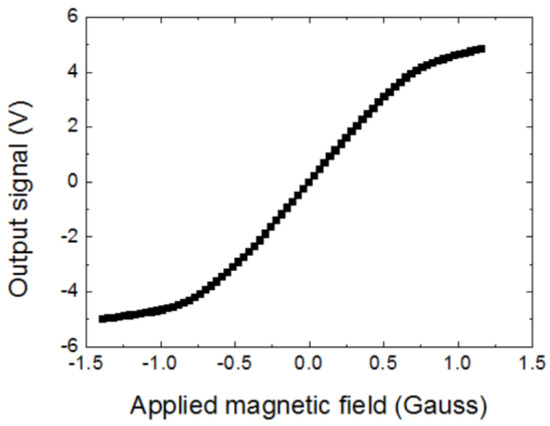 The magnetic sensor was put in a Helmholtz coil to measure the magnetic field response of the magnetic sensor. Figure 10 shows the response of the magnetic sensor to the applied magnetic field. The response was nearly linear when the applied magnetic field was in the range of −0.7 Gauss to +0.7 Gauss. In the linear response range, the voltage/magnetic field transfer factor ΔV/ΔB of the magnetic sensor was about 5 V/Gauss. The earth magnetic field is about 0.5 Gauss. Therefore, there is no difficulty for the magnetic sensor to operate in the earth’s magnetic field.