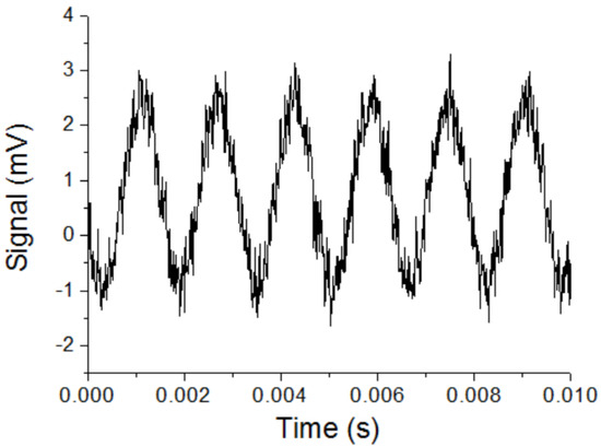 To check the magnetic field resolution of the magnetic sensor, the sensor was put in a Helmholtz coil, and a magnetic field with the frequency of 630 Hz and the amplitude of about 400 pT was applied to the sensor. An amplifier with the gain of 200 times and a band-pass filter with the center frequency of 630 Hz and the bandwidth of 100 Hz were used after the output of the magnetic sensor. Figure 12 shows the output signal of the magnetic sensor. The signal amplitude ΔV was 4 mV for the applied magnetic field ΔB = 400 pT. The noise level of the output signal Vnoise was about 0.7 mV. The bandwidth Δk was 100 Hz. The experimental magnetic field resolution could be estimated by Equation (6). It was about 7 pT/√Hz, which was similar to the results measured by the spectrum analyzer.