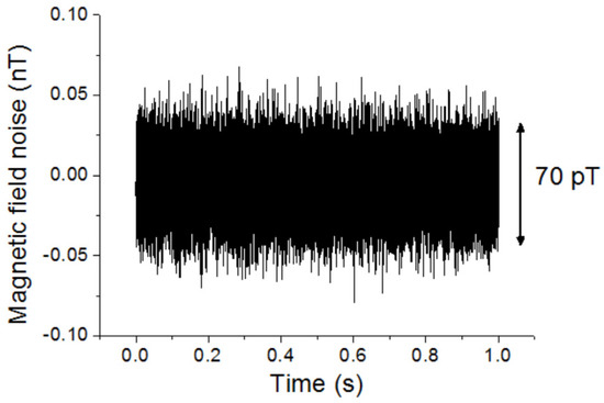 The magnetic field noise of the magnetic sensor at a higher frequency of 630 Hz and the DC magnetic field noise were measured. To reduce the influence of environmental noise, the magnetic sensor was put in a magnetic shielding box. Figure 13 shows the magnetic field noise of the magnetic sensor at 630 Hz. A band-pass filter with the center frequency of 630 Hz and the bandwidth of 100 Hz were used. The magnetic field noise was about 70 pT with the observation bandwidth of 100 Hz. The noise was similar when the frequency was over 100 Hz. Figure 14 shows the DC magnetic field noise with a 10 Hz low-pass filter. It was about 1.5 nT.