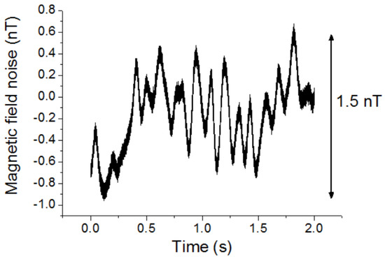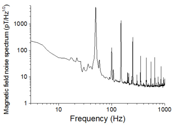 The magnetic field noise spectrum was also measured in our laboratory without shielding. Figure 15 shows the results. The amplitude of the 50 Hz line interference was about 4 nT, and the low-frequency noises were also increased.