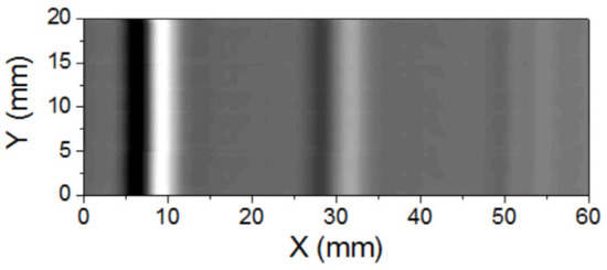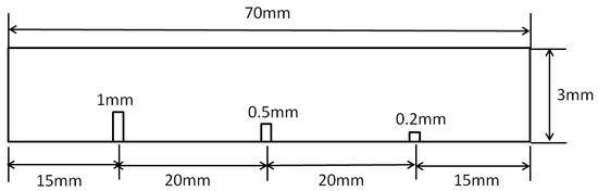 Figure 17 shows the sample of an aluminum plate. The dimensions of the plate were 7 × 3 cm2. The thickness of the aluminum plate was 3 mm. Three slits with the same width of 0.2 mm and different depths of 1 mm, 0.5 mm, and 0.2 mm were made in the aluminum plate. The distance between the slits was about 2 cm.