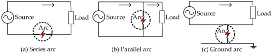 According to the Under Laboratories (UL) Standard UL1699 [6], arcing is defined as a continuous luminous discharge of electricity across an insulating medium, usually accompanied by the partial volatilization of the electrodes, and is a very complicated electromagnetic reaction process [2]. Arc faults are categorized into three types as shown in Figure 1: series arc fault, parallel arc fault, and ground arc fault, among which the series arc occurs the most frequently [7,8,9].