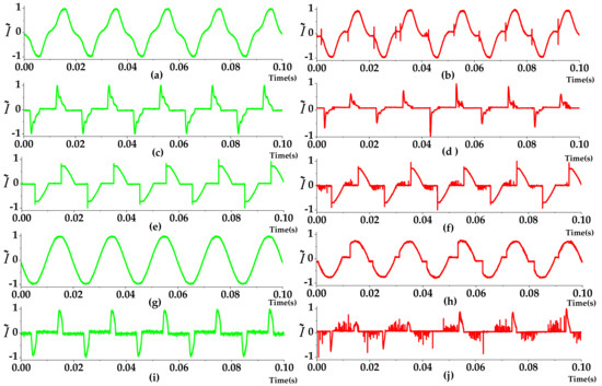 Current waveforms of various loads in normal state and arc state. (a) Vacuum cleaner_Normal; (b) Vacuum cleaner_Arc; (c) Fluorescent lamp_Normal; (d) Fluorescent lamp_Arc; (e) Dimmer_Normal; (f) Dimmer_Arc; (g) Heater_Normal; (h) Heater_Arc; (i) Computer_Normal; (j) Computer_Arc.