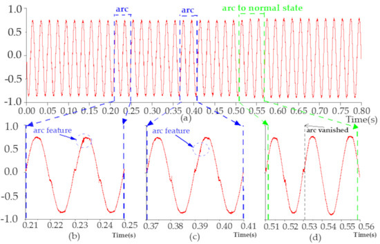Heater load’s current. (a) From arc state to normal state; (b) Arc feature; (c) arc feature; (d) arc vanished randomly.