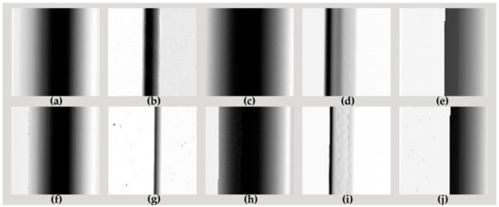 Arc and normal gray image after filtering. (a) Vacuum cleaner_Normal; (b) Computer_Normal; (c) Heater_Normal; (d) Fluorescent lamp_Normal; (e) Dimmer_Normal; (f) Vacuum cleaner_Arc; (g) Computer_Arc; (h) Heater_Arc; (i) Fluorescent lamp_Arc; (j) Dimmer_Arc.