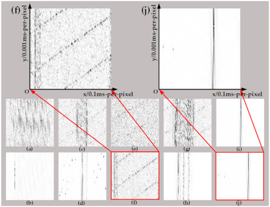 As shown in Figure 5, the arc image and normal image both from the same load without filtering, are similar except a little noise. However, the difference between these images becomes quite clear after digital filter processing. To be specific, an obvious "flat shoulder" feature appears on the left and right sides of the heater image of the arc fault state (Figure 6f), which also showed obvious harmonic fringes and high-frequency noise after filtering. In addition, the filtered image of the dimmer (Figure 6j) has evident cut-off streaks because of the switching action of the silicon tube, leading to less high-frequency noise in the image of the arc state of the dimmer than the electric heater.
