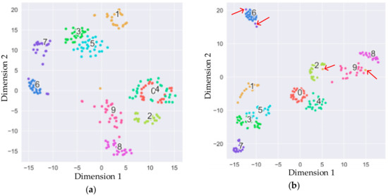 Visualization of the last layer with t-distribution stochastic neighbor embedding (t-SNE). (a) Initial stage of training; (b) late stage of training.