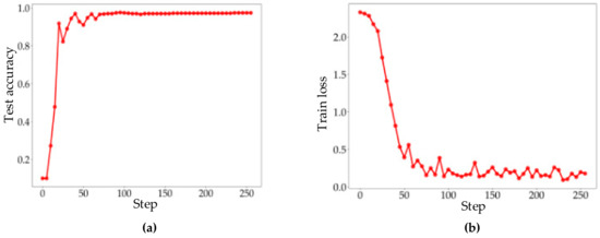 The train loss function and test accuracy trend of TDV-CNN are shown in Figure 10a,b respectively. In the initial stage of training, the loss function decreases rapidly with fast-increasing test accuracy. From the 60th iteration, the variation rate of test accuracy and train loss begin to decrease slowly. The loss function is still in the falling range and the test accuracy is slowly rising, indicating that the network continues to optimize. After 100 iterations, the network has tended to be stable.