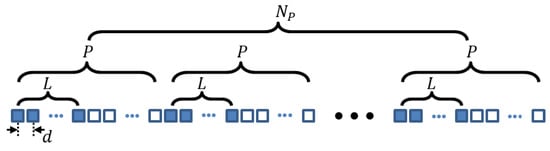 In our previous study, a design rule for eliminating common grating lobes of a pair of Tx/Rx arrays, each array having the form of the SLA model shown in Figure 1, was presented [10]. In this model, L consecutive elements are active in each P-element block, where P is greater than L. The L active elements are defined to be a subarray, and each block containing the subarray is repeated NP times to form the SLA model. Thus, in an SLA, only NP∙L elements are active among NP∙P elements.