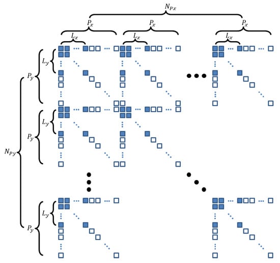 Sparse rectangular array layout. The array comprises NPx∙NPy blocks. In each block having Px∙Py elements, only the two-dimensional (2D) subarray consisting of Lx∙Ly elements (blue colored squares) is active.