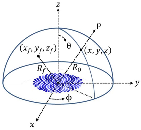 By using the spherical coordinates ux = ux0 − uxf = x/R0 − xf/Rf and uy = uy0 − uyf = y/R0 − yf/Rf, Equation (1) can be rewritten as
