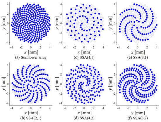 Examples of the spiral arrays: (a) the sunflower array and (b–f) the SSAs. Active elements are colored in blue.
