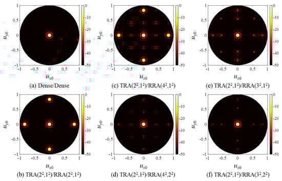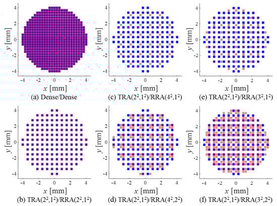 Figure 5a shows the dense array pair on a grid whose beam pattern will serve as the reference for the evaluation of beamforming performance of sparse arrays. For the sparse array pairs in Figure 5b–f, the same TRA with the parameters of Px,T∙Py,T = 2∙2 = 22 and Lx,T∙Ly,T = 1∙1 = 12, denoted by TRA(22,12), was used, but the RRAs were chosen differently. The ones that follow the proposed design rule (Figure 5b,c) used the Rx arrays of RRA(22,12) and RRA(42,12), and the others that did not follow the rule (Figure 5d–f)) used the Rx arrays of RRA(42,22), RRA(32,12), and RRA(32,22).