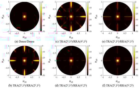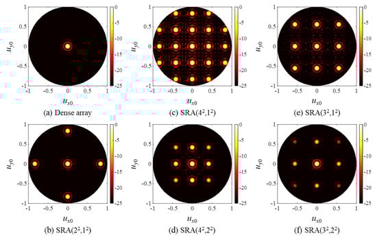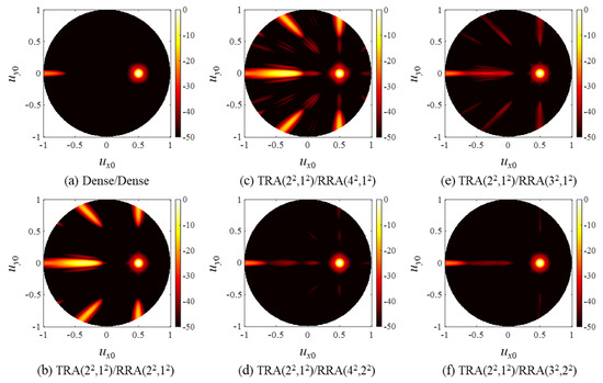 The two-way CW PSFs of the array pairs were calculated by multiplying the Tx/Rx beam patterns. The results are shown in Figure 7. Note that TRA(22,12) was used on the transmission for all the SRA pairs, and its beam pattern was identical to that of RRA(22,12) in Figure 6b. According to Equation (12), all grating lobes of RRA(22,12) were CGLs when paired with TRA(22,12), as shown in the PSF of TRA(22,12)/RRA(22,12) in Figure 7b. Because GCD(4,2) = 2, the TRA(22,12)/RRA(42,12) pair also had CGLs at (ux, uy) = (±λ/2d, 0) and (ux, uy) = (0, ±λ/2d), as can be observed in Figure 7c. On the other hand, TRA(22,12)/RRA(42,22), TRA(22,12)/RRA(32,12), and TRA(22,12)/RRA(32,22) were CGL-free pairs satisfying the design rule (13) and (14), and thus high grating lobes are not found in Figure 7d–f.