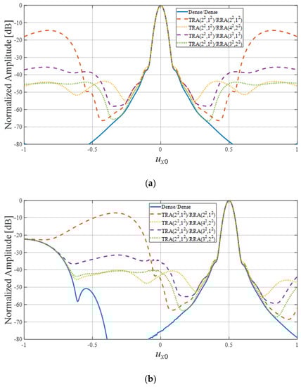 To compare the non-steered, and the steered PW PSFs of the array pairs, their 1D profiles on the ux0 axis (uy0 = 0) are plotted in Figure 10. The low-performance array pair TRA(22,12)/RRA(42,12) was excluded for comparison. Figure 10 shows that all SRA pairs had almost the same BW6. However, TRA(22,12)/RRA(22,12) had significantly higher grating lobes than the other CGL-free SRA pairs.