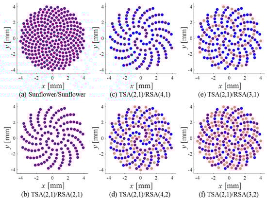 Transmit (blue) and receive (red) spiral array pairs: (a) the sunflower array pair and (b–f) the sparse spiral array (SSA) pairs. The overlapping elements are colored in purple.
