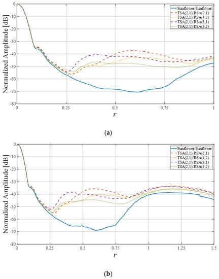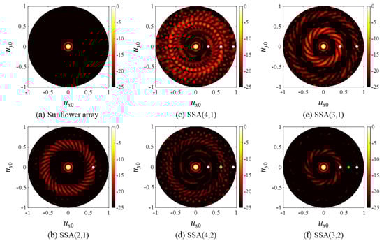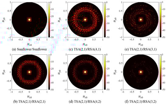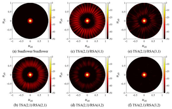 Figure 11 shows a sunflower array pair and six different SSA pairs. Each array had a diameter of 16λ, the same as that of the SRAs in the previous subsection. The arrays were composed of circular elements, and each element had a diameter of so that the element area was equal to that of the square element used for the SRAs. The dense array for the spiral arrays was the sunflower array shown in Figure 11a. The sunflower array is deliberately designed to have 280 elements so that the number of elements of SSA(2,1) is equal to that of SRA(22,12), which is the Tx array for each pair. Consequently, the sunflower array was designed to be much sparser than the dense rectangular array of 553 elements in the previous subsection. As in the SRA case, all SSA pairs in Figure 11b–f used the same TSA, TSA(2,1), and different RSAs. Among them, only the SSA pairs in Figure 11d–f followed the design rule presented in Section 3.
