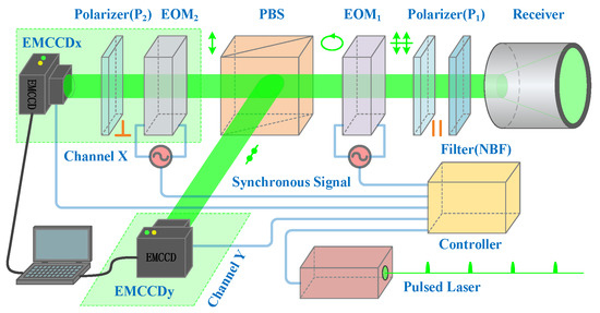 15]. With polarization beam splitting (PBS), the elliptical-polarized light is separated into two orthogonal polarized components; that is, p-polarized and s-polarized light. Alternately, we could use twice as many EMCCD cameras to detect both the p-polarized and the s-polarized light. The p-polarized light passes through channel X and arrives at EMCCDx, while the s-polarized light is reflected to channel Y and arrives at EMCCDy.