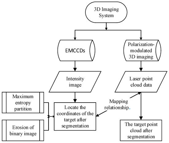 14]. However, owing to the time integration mechanism, EMCCD can only obtain the intensity diagram, but not the depth diagram of the scene. Fortunately, time-resolved imaging can be achieved by means of polarization modulation, in order to obtain the corresponding distance information of each pixel and to obtain 3D point cloud data in the imaging field. We use the characteristics of the system, based on grayscale map, using the maximum entropy adaptive segmentation method, to complete the initial segmentation of the target, combined with the corrosion treatment of images, binary graphs containing only target information can be obtained accurately. Next, the accurate target coordinate position is obtained in the image, and the mapping relationship between target gray coordinate and depth coordinate is established to obtain the target point cloud after segmentation.
