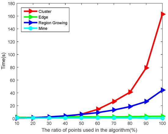Figure 6, the time consumption of the edge segmentation algorithm is relatively stable. With the increase of the number of point clouds, the algorithm is stable around 3 to 5 s, which not only has low segmentation accuracy, but also fails to meet the real-time demand. The region growth segmentation algorithm is represented by the blue curve in