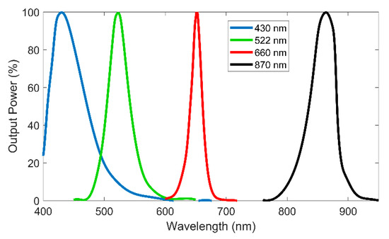 Output power spectrum of the light-emitting diodes (LEDs) used in the sensor identified by its central wavelength in the legend.