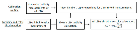 Schematic diagram for the process used to discriminate color from turbidity. Previous calibrations for turbidity are necessary.
