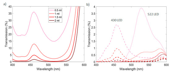 A comparison of these experimental results with the theoretical expected absorption values obtained with the increasing of the red dye concentration in water solutions was performed based in spectrographic measurements taken and presented in Figure 6a. Considering the spectra given by 430 and 522 nm LEDs and the responsivity of the photodetector with wavelength, the real detected intensity expected by the sensor in its transmission photodetector was calculated and presented in Figure 6b.