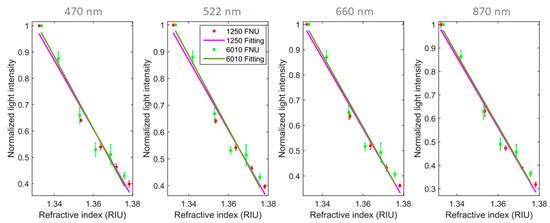 Experimental light intensity variation obtained with the increase of the refractive index units (RIU) and normalized to the refractive index of water for solutions with 0, 1250 and 6010 FNU for all the sensor transmission light sources channels. Linear regressions to the experimental data is also presented with its parameters and root-mean-square deviation (RMSE) calculated in Table 2.