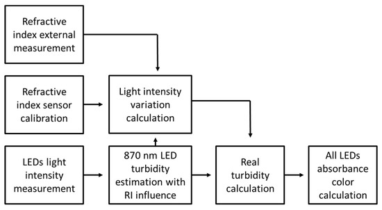 To compensate this phenomenon for posterior calculation of color and turbidity, external measurement of refractive index value using another sensor will need to be performed, but effective compensation for this sensor can be achieved using interpolation values from Table 2. The process starts with the calculation of turbidity using the 870 nm LED as described in Figure 10. Knowing this value of turbidity, the value or refractive index and executing an interpolation from the Table 2 values, the variation of light intensity signal from this solution in relation to a solution with refractive index of water can be assessed. The variation assessment will lead to the real turbidity value of the solution and the latter to the real color absorption value (Figure 10).