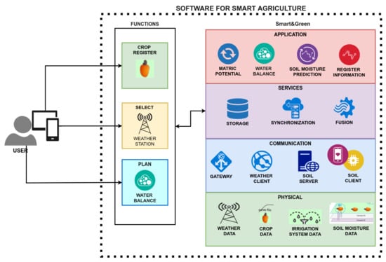 In software engineering, a framework can also be “a mini architecture that can be reused and that provides behavior and a generic structure for a family of software abstractions in a context that specifies the collaboration and use of them into a given domain” [56]. Therefore, given the smart agriculture domain and the context of smart irrigation, the Smart&Green framework specifies the structure of a set of concrete and abstract classes to implement modules for the gathering, storage, synchronization, and fusion of data, as well as mathematical models (Appendix A) which describe irrigation management. Irrigation management determines the behaviors of the classes and modules. As a mini architecture, the proposed framework can be reused with different smart agriculture software with the generic functionalities of irrigation management.