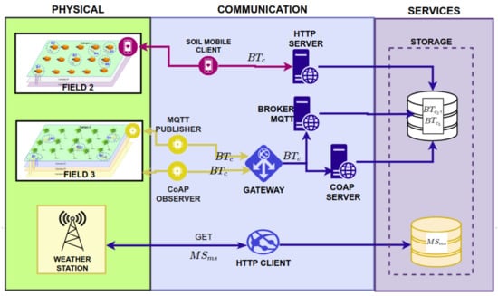 The Service layer supports the Application layer by storing data provided by Smart&Green users and synchronizing crop, weather station, and soil data when required by any irrigation management module. The Service layer also carries out fusion tasks for data of soil moisture sensors (e.g., fields 2 and 3 of Figure A1) or the soil moisture prediction.