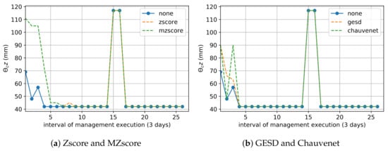 DRO tasks apply criteria and algorithms defined by specialist users to immediately detect and remove outliers. The Register module of the Application layer allows for the creation of threshold values for soil data. DRO algorithms are specific to the soil layer monitored. According to [58], the Z-score is more efficient for data series at the most superficial soil layer (e.g., cm). In contrast, the Generalized ESD (Extreme Studentized Deviate) algorithm works well with data at depth of cm. The Smart&Green framework has implementations of the Chauvenet, Z-Score, Modified Z-Score, and Generalized ESD algorithms.