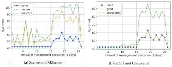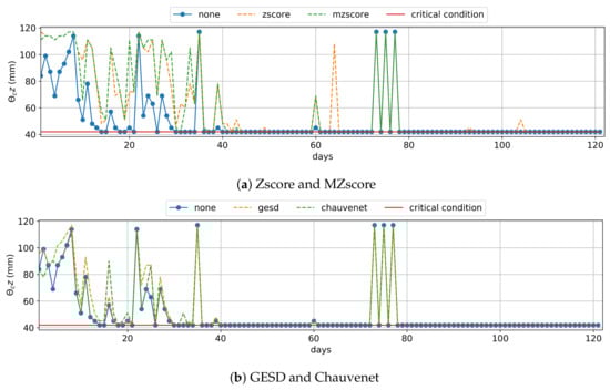 The pattern recognition of water consumption by a crop radicular system, presented in [28], is an outlier detection technique based on a time-series analysis of soil moisture gathered at several depths before, during, and after irrigation. This technique allows for the identification of sensors with poor operation, which indicates the need for calibration or change.