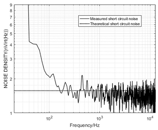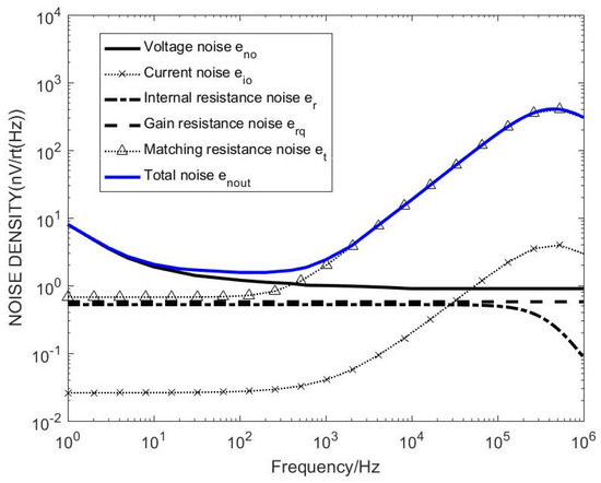 It can be seen from Figure 7 that the matching resistor thermal noise affects the total noise of the sensor after adding the matching resistor, which has a larger effect than other noises. When the frequency is above 1 kHz, the current noise increases, and the matching resistor thermal noise increases, still contributing to the total. The main component of noise, the noise level reaches 100 nV level, affecting the global noise, so the most important consideration for reducing system noise is to reduce the matching resistance thermal noise.